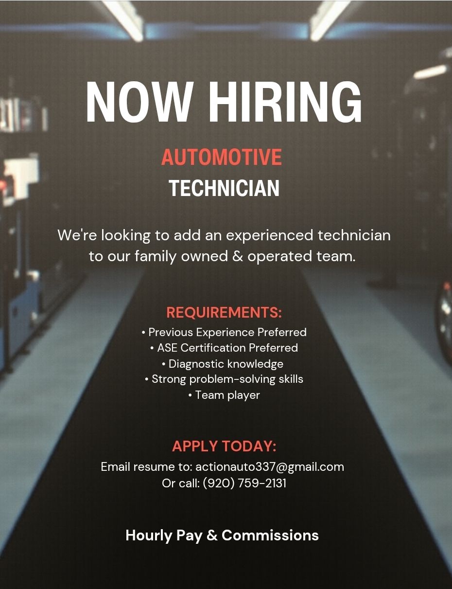 🚗 Action Auto Service is Hiring!We’re looking for an experienced Automotive Technician to join our family‑owned and operated team. If you have diagnostic skills, problem‑solving ability, and a passion for quality work, we want to hear from you!